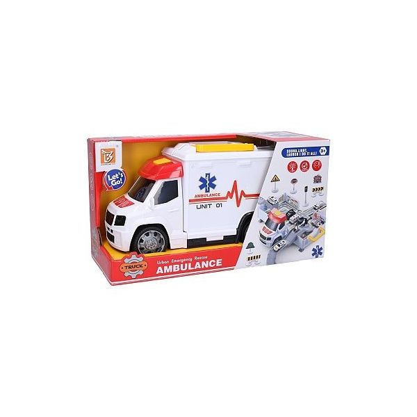 Auto sanitka garáž nemocnice. Rozměry sanitky 33,5x18x13 cm. Baterie 3xAG13, součástí balení. Vydává světelné a zvukové efekty. Aktivace tlačítky na kapotě. Sanitku je možné rozložit na garáž areál nemocnice, s autíčky a značkami. Volná kola. Velké tlačítko na střeše - odemčení sanitky. Věk: 3+