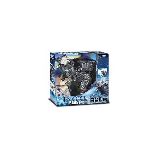 Ledový drak dýmící s efekty RC na dálkové ovládání. Rozměry 56x21x30 cm. Infračervený port. Světelné, zvukový a dýmící efekty. 4xAA baterie do draka, 2xAAA do ovladače nejsou součástí. Ovladač - tlačítko chůze, tlačítko dýmící efekty, tlačítko mávání křídly a zvukové efekty (řev), přepínač kanálů A,B,C. Nádržka na vodu na hlavě. Nádobka na vodu součástí. Ocas se jednoduše nasune do těla draka společně s propojovacím kabelem. Používejte podle obrázků na obalu. Provoz 30 min, dosah 8 m. Věk: 3+