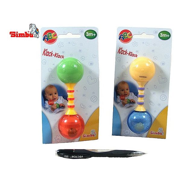 Veselé chrastítko ve tvaru činky.Jedna strana je průhledná s kuličkou uvnitř