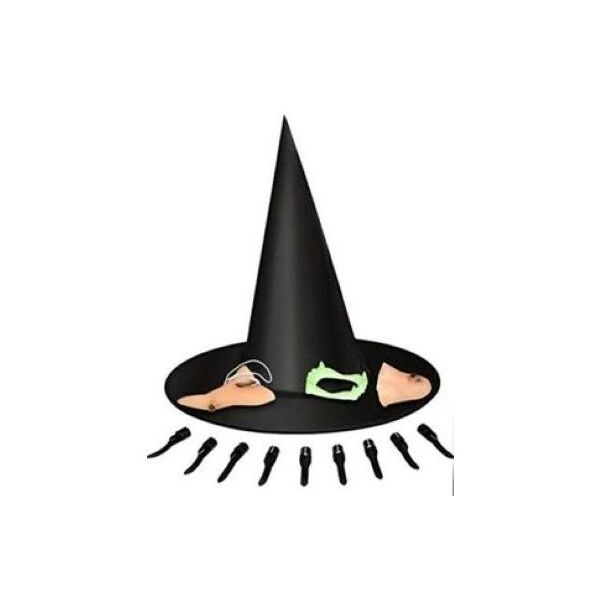 Set pro každou správnou čarodějniciSet obsahuje: bradu na gumičce, nos na gumičce, 10 nasazovacích prstů s nehty, zuby a velký čarodějnický klobouk. věk: 6+