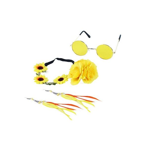 Parádní sada hippies, ve které najdeš čelenku se žlutými kvítky, dlouhé žluto-oranžové náušnice a brýle lenonky. Perfektní doplňky na karneval či párty.