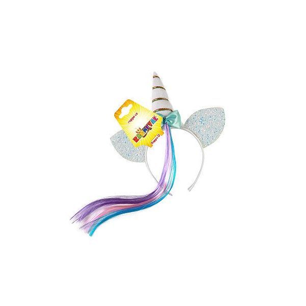 Senzační karnevalová čelenka ve stylu jednorožce! Bílá čelenka s rohem se stříbrnýma ušima, ozdobená mašlí a duhovým pramínkem vlasů. Věk: 3+
