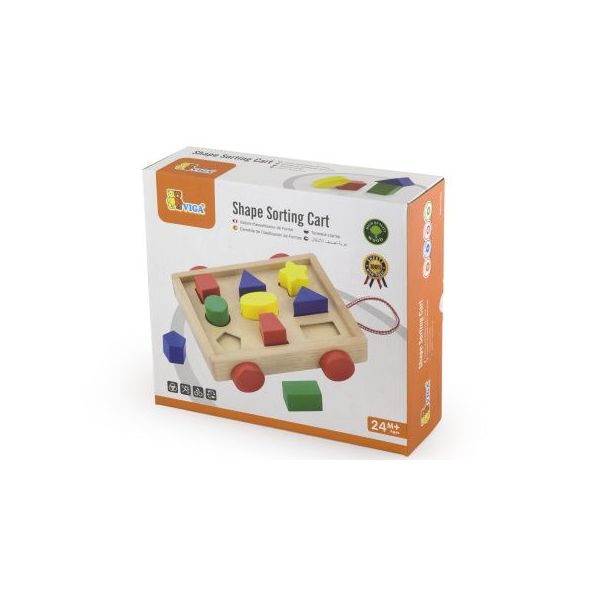 Dřevěná vkládačka - vozík. Balení obsahuje vozík o velikosti cca 24,5 x 22 x 7 cm a 9 kostek různých tvarů a barev na vkládání. Rozměry balení cca 25,5 x 23,5 x 8 cm. Věk 24m+