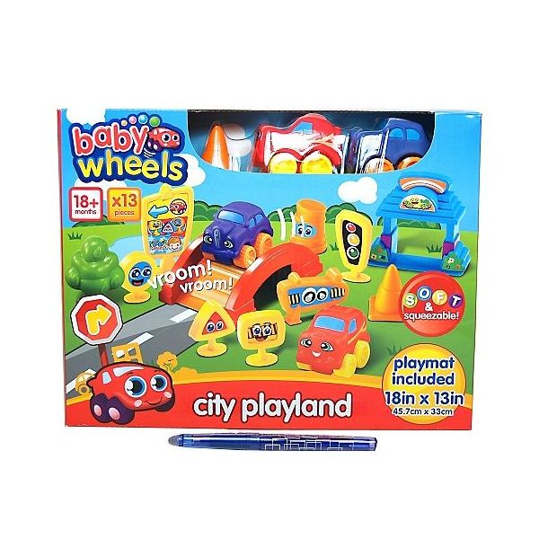 Silnice s auty pro nejmenší obsahuje podložku se silnicí o rozměrech cca 45,7 cm X 33 cm ,na kteru lze libovolně rozmístít plastový nadjezd,stanici,závory ,stromy,značky.Součástí balení 2 gumová autíčka o velikosti cca 6 cm.Rozměr balení cca 29 cm X 22 cm X 22 cm.Věk 18 měs +