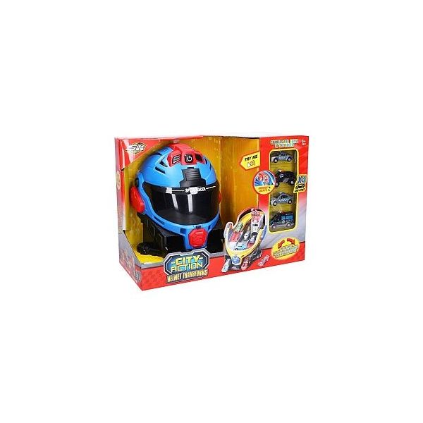 Policejní stanice helma. Rozměry 20x32x20 cm. Světelné a zvukové efekty tlačítkem na helmě. 3xAG13 baterie součástí. Součástí 4 kovová auta 6,5 cm s volnými koly, výtah. Věk: 3+