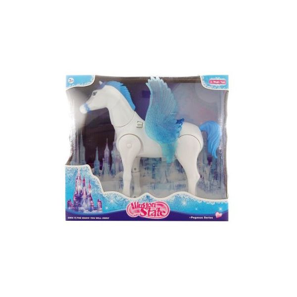 Plastový koník s hýbajícími křídly. Po vložení baterií koník chodí, hýbe křídly a hraje. Napájení na 4 AA baterie (nejsou součástí balení). Rozměry balení cca 32,5 x 29 x 9,5 cm. Věk 3+
