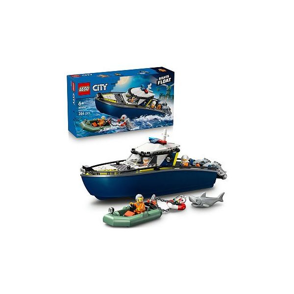 Záludný zloděj v superrychlém člunu uhání z přístavu LEGO® City s ukradeným rubínem! Ponořte se do akce s policisty na palubě velké policejní lodě! Toto majestátní plavidlo má vše, co potřebujete k chytání zločinců, včetně dvou závěsných motorů a cely na palubě. Vyhněte se hladovému žralokovi v zuřivých vlnách a zachraňte situaci. Čas na honičku v LEGO® City! Malí hrdinové si přímo zamilují stavebnici LEGO® City (60456) Honička v policejní lodi. Tato stavebnice je ideální pro stavitele od 6 let a obsahuje policejní loď se dvěma závěsnými motory a vězeňskou celou na palubě a k tomu motorový člun. Obě lodě plují po vodě a děti se s nimi můžou vydat na napínané policejní honičky se 2 policisty, zločincem, rychlým žralokem a ukradeným rubínem! Součástí této stavebnice LEGO City je podrobný tištěný návod na stavění a digitální pokyny v aplikaci LEGO Builder, což je digitální průvodce stavěním s intuitivními nástroji přibližování a otáčení. Umožní jim prohlížet si modely ze všech úhlů, zatímco na nich pracují. Tvoje město, tvoje pravidla! Se stavebnicemi LEGO City se děti vydají na akční stavitelská a herní dobrodružství plná tvořivé zábavy. Zkombinujte tuto policejní stavebnici LEGO k dalším (prodávají se samostatně) z řady LEGO City a zažijte ještě více dobrodružství! Stavebnice obsahuje 264 dílků. • Stavebnice Honička v policejní lodi pro malé hrdiny – Děti od 6 let se se stavebnicí LEGO® City Honička v policejní lodi ponoří do oceánu akčních dobrodružství během pronásledování zloděje • Co najdete v krabici? – Vše, co potřebujete k sestavenímodelu policejní lodi a motorového člunu zločince a navíc také 2 minifigurky policistů, minifigurku padoucha a figurku žraloka • Vlastnosti a funkce – Děti posadí 2 minifigurky policistů do policejní lodě, zamknou zloděje v cele a vyplují s člunem zloči nce a policejní lodí na vodu • Doplňky pro minifigurky – Tato stavebnice pro děti obsahuje zábavné doplňky LEGO®, včetně rubínu, pout, baterky, řetězu a záchranného kruhu • Dárek LEGO® k jakékoli příležitosti – Darujte tuto stavebnici k jakékoli příležitosti milovníkům lodí a parádních akčních hraček od 6 let • Sbírejte další stavebnice – Spojte tuto stavebnici lodě s ostatními modely z řady LEGO® City (prodávají se samostatně) pro ještě větší porci zábavy a dobrodružství • Město bez hranic – Stavebnice LEGO® City děti inspirují ke stavění, tvoření, prozkoumávání a kreativnímu hraní a najdou v nich modely budov, vozidel a minifigurky občanů • Rozměry – Stavebnice se skládá z 264 dílků a model policejní lodi měří přes 11 cm na výšku, 31 cm na délku a 8 cm na šířku