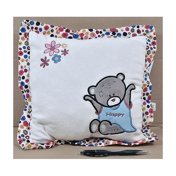 Tento plyšový polštářek se bude líbit dětem i dospělým. Měkký bílý polštářek s veselým motivem medvídka a kytiček. Polštářek je o velikosti cca 32x32 cm.