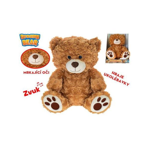 Medvěd plyšový 34cm sedící mrkající oči na baterie hrající ukolébavky. Věk: 3+