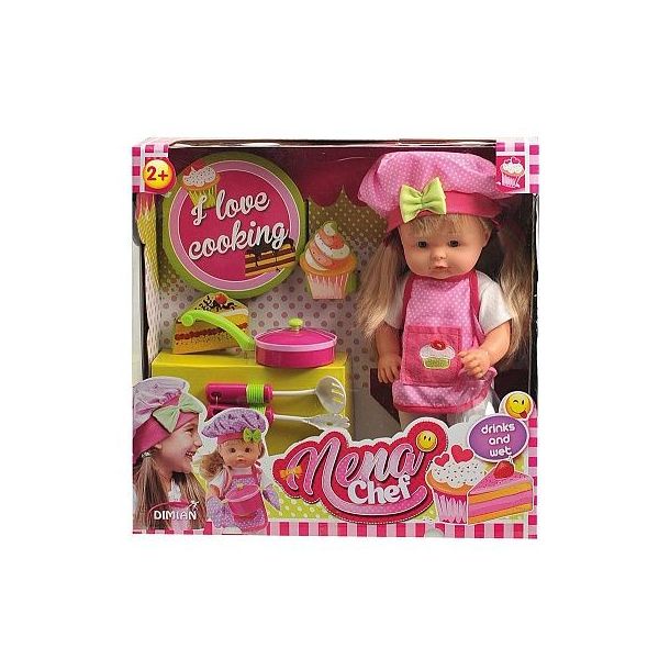Panenka Nena umí 50 slov, pije a čůrá. Obsah balení: Nena 36cm, pánvička, 2ks kuchařského náčiní, lahvička na pití.