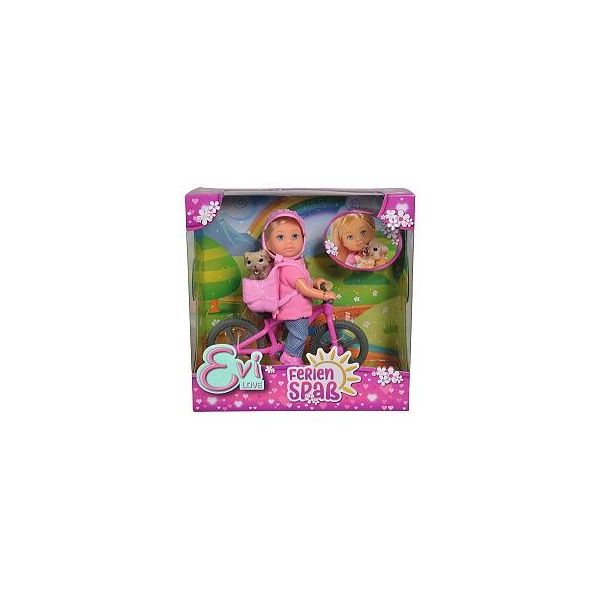 Panenka Evička v cyklistické helmě s jízdním kolem a s jejím pejskem sedícím v batohu. Výška panenky 12 cm. Věk: 3+