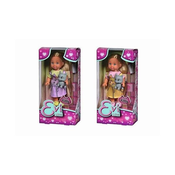 Panenka Evička v roztomilých kočičích šatech s kočičkou a lahví na pití. Velikost panenky 12 cm. Věk: 3+