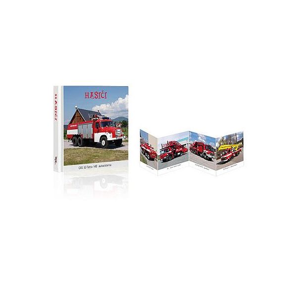Harmonikově skládaná kniha s tvrdými stránkami, na každé straně je jiná fotografie hasičského vozu s jeho označením. Počet stran: 14 Délka rozloženého leporela: 60,5 cm Rozměry složeného leporela: 9 x 8,5 x 2 cm