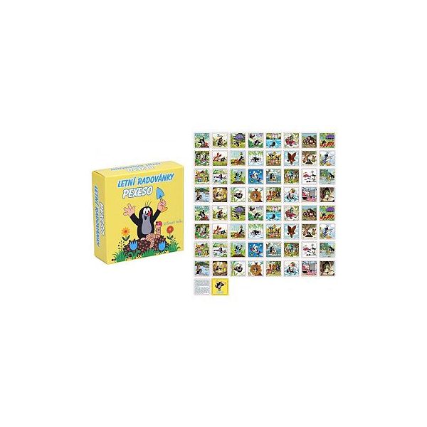 Pexeso s motivem krtečka a letních radovánek v praktické papírové krabičce. Pexeso obsahuje 32 párů obrázků (64 kartiček). Věk: od 3 let Rozměr: kartička 6,3 x 6,3 cm