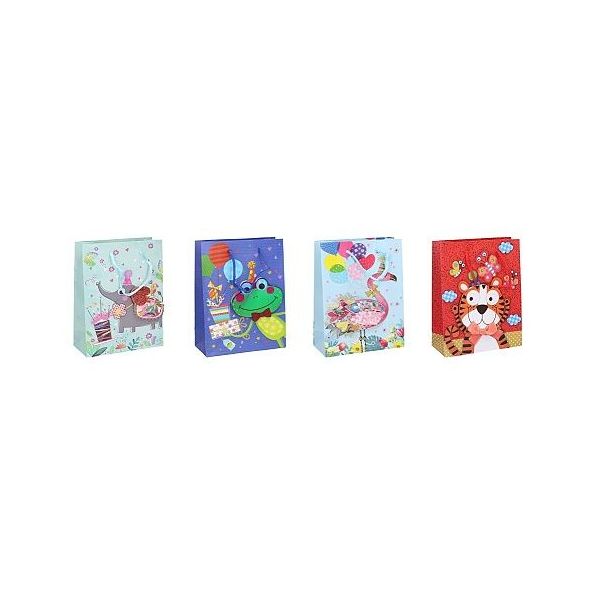 Dárková taška o velikosti S 23x18x8 cm Dětská. 4 zvířátka: plaměňák, tygr, slon, žaba.