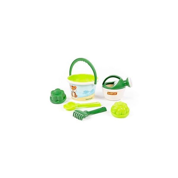 Sada na písek č. 647 safari: Kbelíček střední se samolepkou, sítko, lopatka, hrabičky, formičky. Baleno v síťce, rozměry: 174x160x155 mm /+1/ *****