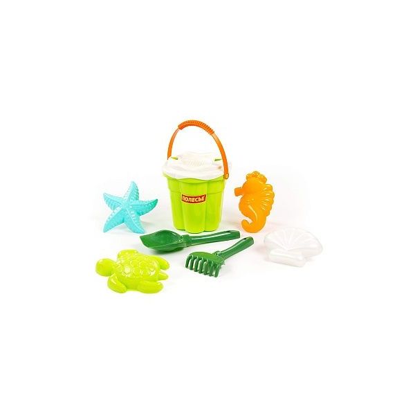 Sada na písek č. 648 safari: Kbelíček-střední tvar květ, sítko, lopatka, hrabičky, formičky. Baleno v síťce, rozměry: 170x165x290 mm /+1/ *****