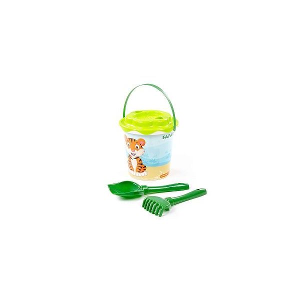 Sada na písek č. 653 safari: Kbelíček se samolepkou, sítko, lopatka, hrabičky. Baleno v síťce, rozměry:180x175x275 mm ,/+1/ *****