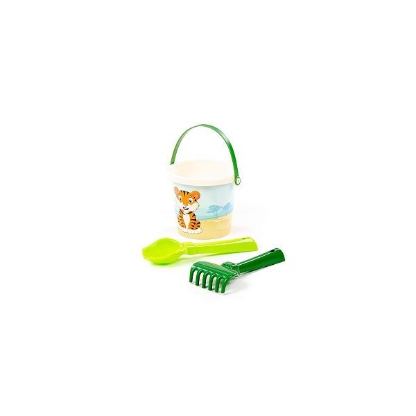 Sada na písek č. 656 safari: Kbelíček malý se samolepkou, lopatka, hrabičky. Baleno v síťce, rozměry: 120x115x150 mm +1