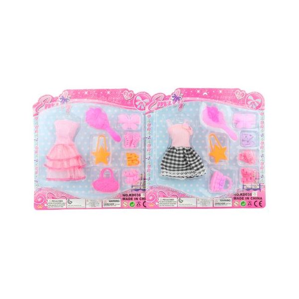 Šatičky s doplňky pro panenky. Balení obsahuje šatičky, hřebínek, 3x boty, 2 kabelky a sponku. Rozměry balení cca 24 x 24 x 3,5 cm. Věk 3+