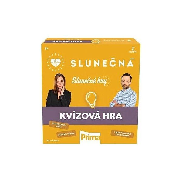 Seriál Slunečná se stal podkladem pro kvízovou hru, kde hráči uplatní znalost jednoho z pořadů FTV Prima. Hráči mají v nabídce 5 okruhů otázek a speciální kategorii „Výzva“. Roztáčí ruletu a odpovvídají na otázku, určenou střelkou. Každá správná odpověď znamená postup vpřed. Kdo dosáhne jako první cíle, vyhraje. Obsah balení: 6 figurek v podobě herců ze seriálu hrací plán s ruletou, 220 kvízových karet návod Kupte dětem kvízovou hru a hrajte s nimi! Vhodné pro děti od 8 let Hra pro 2 – 6 hráčů