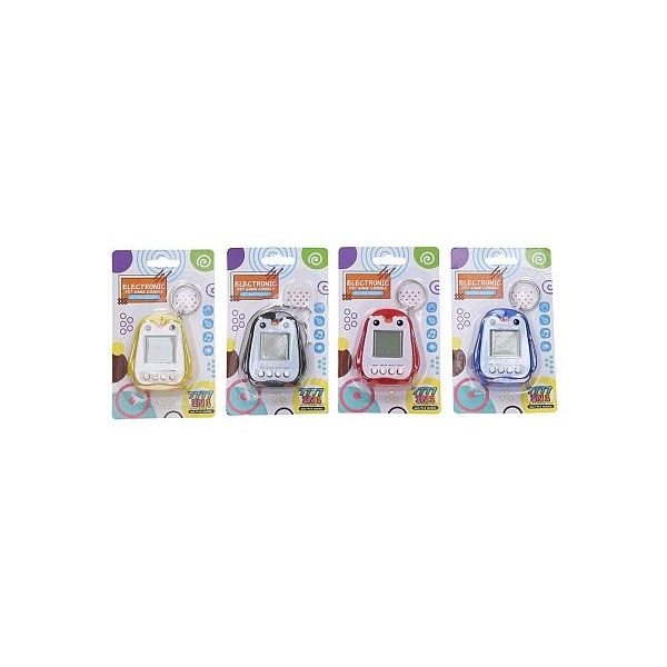 Mazlíček elektronický hra tučňák. Rozměry 7,4x6,1x2,6 cm. S kroužkem na klíče. Display box 12 ks. 4 varianty - žlutá, červená, modrá, černá. Baterie 2xAAA, nejsou součástí. Handheld herní konzole. Je možné si zvolit z velkého množství mazlíčků. Reset - resetuje zařízení zpět na výběr zvířátka. Decide - přepínání/volba. Select - potvrzení volby. Cancel - zpět. Věk: 3+