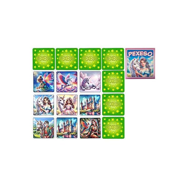 Pexeso Jednorožec v krabičce. Balení obsahuje 64 karet (32 párů) + 2 karty s pravidly. Rozměr krabičky 8x8x2,5 cm.