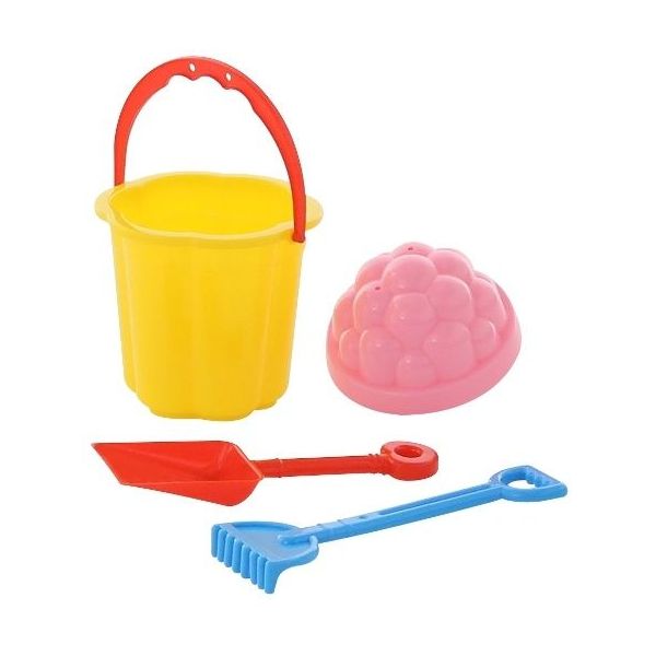 Sada na písek č. 65: Kbelíček střední - tvar květ: formičky, hrabičky, lopatky /+1, baleno v síťce, rozměry: 96 x 90 x 130mm