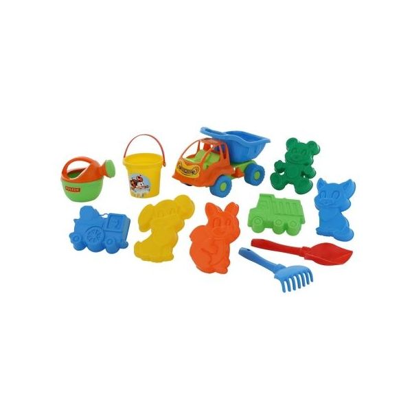 Sada na písek č. 301: Auto Mravenec: Kbelíček malý: formičky, konývka, lopatka, hrabičky. Baleno v íťce, rozměry: 300 x 200 x 300 mm/+1