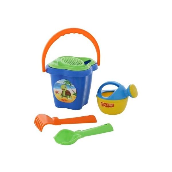 Sada na písek č. 237: Kbelíček střední - tvar květ: Sítko, konývka, hrabičky, lopatka, Baleno v síťce, rozměry: 170 x 145 x 195 mm /+1