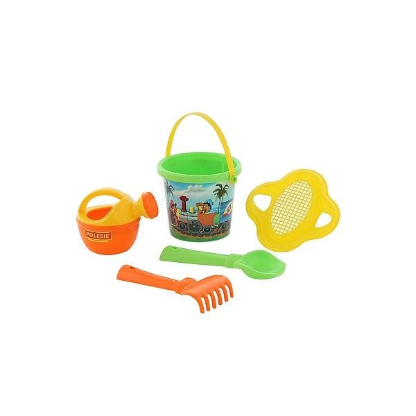 Sada na písek č. 210: Kbelíček malý IML, Sítko, konývka, hrabičky a lopatka. Rozměry: 132 x 132 x 200mm /+1