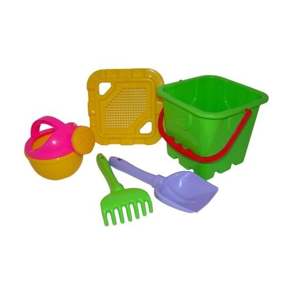 Sada na písek č. 284: Kbelíček - tvar pevnost, velký: sítko, konývka, lopatka, hrabičky. Baleno v síťce, rozměry. 180 ?165 ?268mm /+1