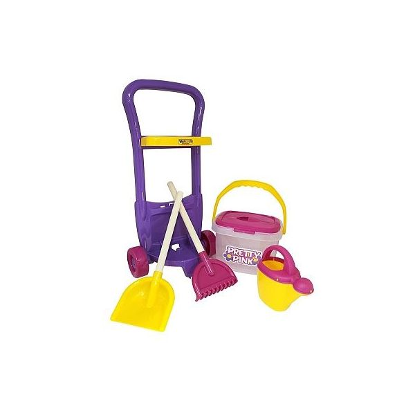 Sada na písek č. 396 Pretty Pink": Vozík Caddie, lopatka, hrabičky, konývka, kyblík. Baleno v síťce, rozměry: 298 x 205 x 575 mm /+1 ****"
