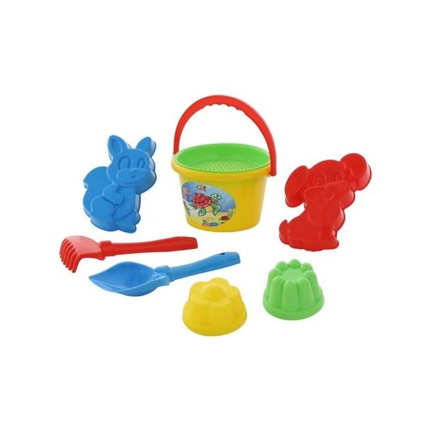 Sada na písek č. 143: kbelíček střední: sítko: lopatka, hrabičky, formičky. Baleno v síťce, rozměry: 227 x 155 x 160 mm /+1