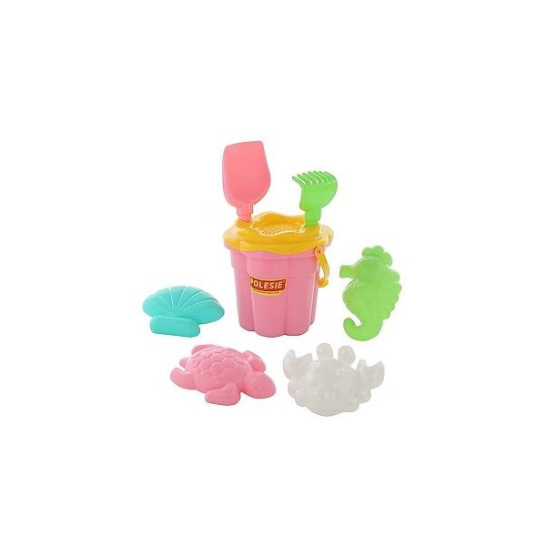 Sada na písek č. 307: Kbelíček střední-tvar květ: Sítko, formičky, lopatka, hrabičky. Baleno v síťce, rozměry: 170 x 165 x 290 mm /+1 **