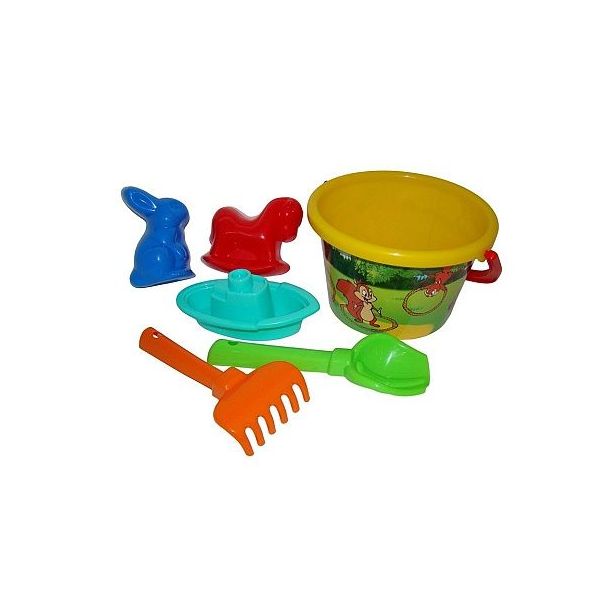 Sada na písek č. 251: Kbelíček střední IML, Lopatka, hrabičky, lodička a formičky. Rozměry: 174 x 165 x 125 mm. Baleno v síťce. /+1 ****