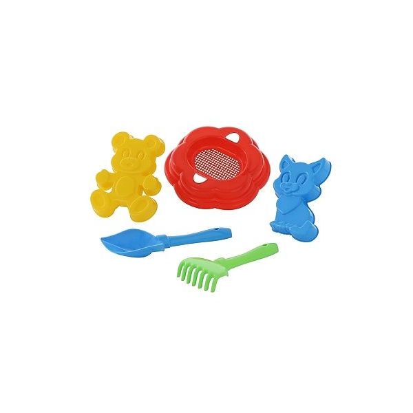 Sada na písek č. 90: lopatka č.5, hrabičky č.5, formičky, sítko. Baleno v síťce, rozměry. 225 ?190 ?115mm /+1 ****