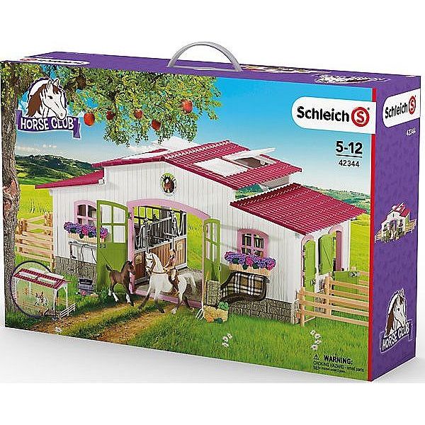 Se svými zelenými dveřmi a růžovými okny vypadá prostě nádherně! Koně jsou ustájeni ve velkých boxech. Mají spoustu balíků slámy a krmiva, ale všichni chtějí vyjet jako první. V kombinaci s výběhy vytváří odnímatelná střecha pod širým nebem jízdárnu. Stáj má posuvné dveře a střešní okna. Stáje jsou vybaveny koryty, stojany na sedla a uzdy. Obsahuje nálepky pro psaní jmenovek. Sladké květiny v truhlících. Sada obsahuje: dva koně, krmení a doplňky pro hřebelcování. Rozměr: 83 x 26 x 39 cm Rozměr kartonu: 56 x 37 x 14 cm Vhodné pro děti: 5-12 let Ručně malovaná, detailně propracovaná stáj s koňmi a mnoha doplňky.