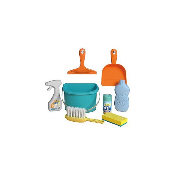 Úklidový set 8ks. Obsahuje kbelík, lopatku, stěrku, čisticí prostředky, smetáček. Věk: 3+
