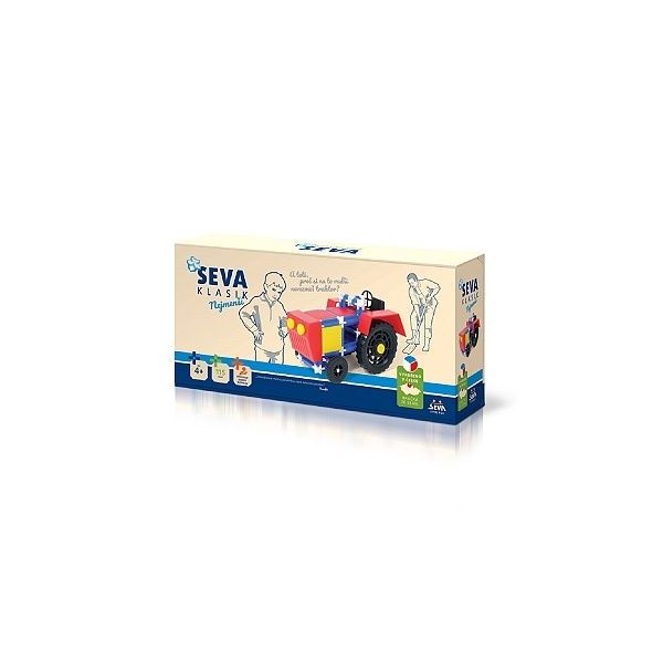 Stavebnice SEVA KLASIK - Nejmenší obsahuje 115 dílků, ze kterých si můžete sestavit originální traktor dle přiloženého návodu nebo dle své vlastní fantazie. Bestseller značky SEVA – originální traktor, je koncipovaný pro ty nejmenší stavitele. Nyní ho najdete v novém, moderním obalu pod značkou SEVA KLASIK. Traktor je v pestrých barvách, které vždy zaujmou jak kluky, tak i holky. Z této stavebnice lze díky unikátním dílkům sestavit originální traktor a nejen to. Co všechno dokážete ještě postavit, záleží pouze na Vás a na Vaši fantazii! V balení najdete také praktický návod, díky kterému bude sestavení traktoru pro Vaše ratolesti úplná hračka. Navíc si děti budou rozvíjet technické myšlení a kdo ví, třeba se jim bude zrovna tato schopnost v životě jednou hodit… Polytechnická stavebnice Seva byla na trh uvedena v roce 1979 a stala se natolik oblíbenou, že v roce 2014 oslavila svoje 35 výročí. Stavebnice SEVA je kreativní, dětem rozvíjí mysl i manuální zručnost a její variabilita určitě osloví i Vás. Můžete si z ní postavit funkční vozidla, stroje, letadla, budovy, nábytek, lodě, vlaky... Její věková hranice není nijak omezená. I když jako výrobce doporučujeme stavebnici pro děti od 4 let, tak máme zjištěno, že za dozoru rodičů si s ní vyhrají i 3 leté děti. A když přeskočíme školku a školu pak Vám prozradíme, že si z ní rádi staví rodiče a dokonce i prarodiče. Ryze ČESKÁ stavebnice SEVA neobsahuje nebezpečné ftaláty, není tedy důvod proč by měla chybět v některém dětském pokojíčku. Všechny stavebnice Seva jsou navíc navzájem kompatibilní, proto je můžete neustále rozšiřovat. SEVA se již nevyrábí pouze v modrobílém provedení, ale existuje spoustu dalších barevných provedení. Rozměry: 16 x 31 x 7 cm Hmotnost: 0,4538 kg