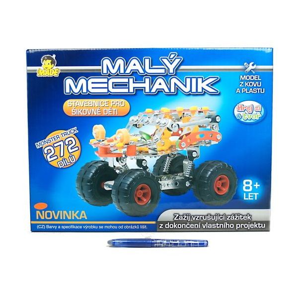 Dětská stavebnice Malý mechanik" z řady "Hraj si a tvoř" Stavebnice je podobná stavebnici MERKUR Model auta se skládá pomocí šroubků z kovových součástí a plastových doplňků. Vždy lze složit pouze jedno autíčko. Vyrobeno z kovu a plastu.. Hračka je doporučena pro děti od 8 let. Obsahuje 272 dílků."