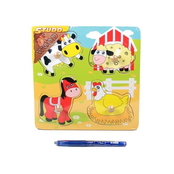 Krásně barevná dřevěná vkládačka – zvířata na farmě. Každé zvířátko zapadá pouze na své určené místo. Děti se při hře učípojmenovávat zvířata – kravičku, ovečku, koníka a slepičku adalší.Tato hrací deska procvičuje dětskou logiku a jemnou motoriku.Z kolekce dřevěné hračky od kvalitní značky Studo Wood.