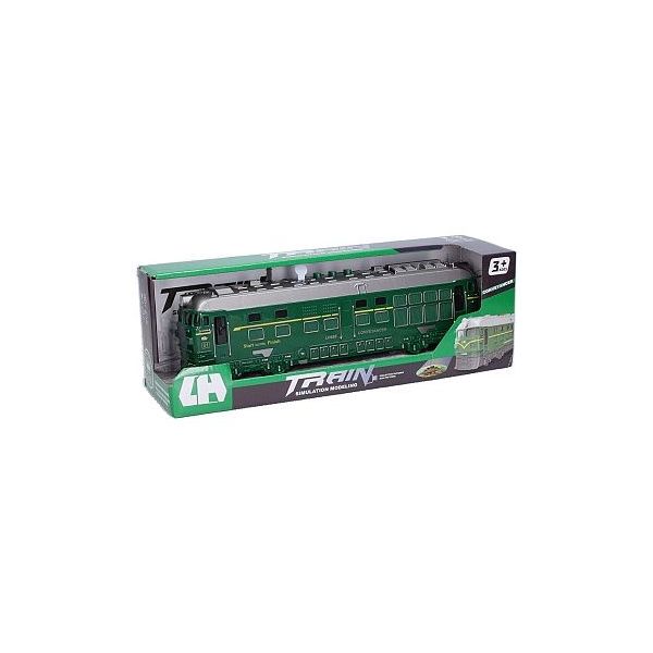 Vlak na setrvačník s efekty a projekcí zelený. Rozměry 33x8x6 cm. Vydává světelné a zvukové efekty, projekce. Aktivace tlačítky na střeše (zvuky vlaku a železnice). Baterie 3xAG13, součástí balení. Věk: 3+