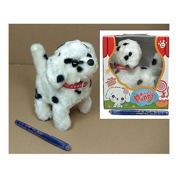 Pejsek chodící o velikosti cca 14 cm X 16 cm.Pejsek chodí a štěká sám,dokud vypínač neposunete do polohy OFF.Provoz na 2 baterie AA.Věk 3+